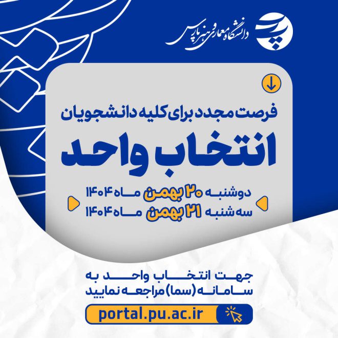 به اطلاع دانشجویان دانشگاه معماری و هنر پارس در تمامی مقاطع تحصیلی میرساند، آغاز انتخاب واحد نیمسال دوم سال تحصیلی...